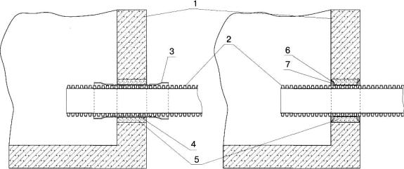 Рис.5 Проход канализационного трубопровода сквозь стенки колодца и другие строительные конструкции 1 - стенка колодца; 2 - труба; 3 - соединительная муфта; 4 - резиновое кольцо; 5 - заделка цементным раствором; 6 - манжета стенового ввода; 7 - подкладная лента в сухих грунтах