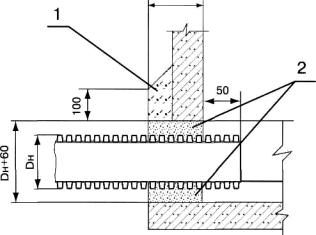 Рис. 6. Детали заделки гофрированных труб в лотковой части сборных железобетонных канализационных колодцев: 1 - бетон; 2 - асбестоцементный раствор; 3 - гидроизоляция; 4 - пакля, пропитанная в жидком полиизобутилене; 5 - стальная труба-футляр (для труб Дн ≤ 160 мм); 6 - водоупорный замок. 4. Строительство подземных самотечных сетей4.1. Земляные работы 4.1.1. Земляные работы при строительстве самотечных канализационных сетей, крепление стенок траншей, водоотлив и водопонижение следует выполнять в соответствии с требованиями СНиП 3.02.01-87. 4.1.2. Ширина траншеи по дну равняется наружному диаметру трубы плюс 40 см. Дно траншеи должно быть выровнено по нивелиру и иметь проектный уклон. На дне траншеи не должно быть выступающих твердых включений, на которые опирается труба при ее укладке. При укладке гофрированных труб на искусственное (бетонное и т.п.) основание рекомендуется устройство песчаной подушки толщиной не менее 10 см. 4.1.3. Трубы следует укладывать на сухое, не промерзшее дно траншеи. 4.1.4. Трубы следует соединять друг с другом последовательно на дне траншеи. По мере укладки труб их следует присыпать грунтом с боков траншеи, обеспечивая прямолинейность трубопровода. Применяемый грунт не должен иметь твердых включений. 4.1.5. Засыпку пазух траншеи и их уплотнение следует вести послойно толщиной 5 см в случае глинистого грунта и 10 см - песчаного. 4.1.6. При обратной засыпке гофрированных трубопроводов поверх защитного слоя грунт не должен содержать крупных твердых включений размерами более 30 см. 4.1.7. Трубы и детали трубопроводов, поступающих на объект, проходят входной контроль качества: • наличие сопроводительной документации; • выборочный визуальный осмотр труб и деталей трубопроводов, контроль их размеров; • контроль качества складирования и хранения 4.2 Строительные работы. 4.2.1. Трубы и муфты перед монтажом раскладывают на бровке траншеи. 4.2.2.Монтаж гофрированных труб осуществляется на дне траншеи по следующей технологии: • очистка от грязи и масел гладкого конца смонтированной трубы и внутренней поверхности двухраструбной муфты монтируемой трубы; • смазывание резинового кольца и внутренней поверхности двухраструбной муфты мыльным раствором или глицерином; • надвижение трубы с двухраструбной муфтой на гладкий конец трубы до упора, получаемое соединение приведено на рис. 2; • для облегчения монтажа допускается применение рычага, упираемого в торец монтируемой трубы. После сборки соединения рекомендуется щупом толщиной до 0,5 мм проверить наличие резинового кольца в раструбной щели. 4.2.3. При засыпке пазух и защитного слоя грунта над трубопроводом соединения труб оставляют не засыпанными для возможности осуществления контроля их герметичности в процессе предварительных гидравлических испытаний. 4.2.4. После положительных предварительных испытаний на герметичность выполняется засыпка грунтом стыковых соединений труб, уплотнение грунта в приямках и подбивка вручную грунта под двухраструбными муфтами. Уплотнение грунта пазух и защитного слоя производится послойно с использованием механических трамбовок. 4.2.5.Сборка соединений на резиновых кольцах допускается при температуре наружного воздуха не ниже минус 5°С. 5. Испытания подземных самотечных сетей из полиэтиленовых гофрированных труб5.1. Гидравлические испытания самотечных кан