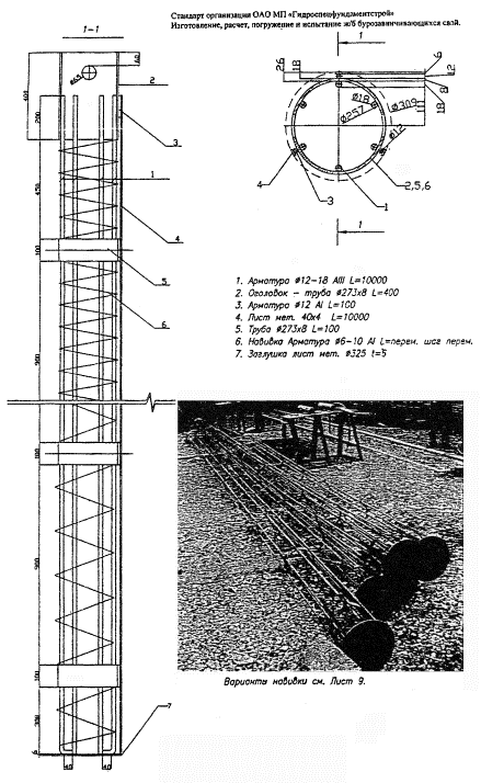 4. Изготовление бурозавинчивающихся железобетонных свай4.1. Исходные материалы для производства бурозавинчивающихся железобетонных свай должны иметь сертификаты и соответствовать действующим государственным стандартам: - Цемент - ГОСТ 10178-76 - Щебень, гравий, песок - ГОСТ 10268-80 - Арматура - ГОСТ 10922-75; ГОСТ 5781-82. 4.2. Железобетонные буро-завинчивающиеся сваи диаметром 315-410 мм изготавливают на рабочем стенде по устройству монолитных железобетонных конструкций, с использованием специализированного оборудования для производства работ по изготовлению железобетонных изделий, 4.3. Порядок изготовления железобетонных буро-завинчивающихся свай: а) Изготавливается инвентарная металлическая опалубка, которая представляет собой разрезанную по длине трубу диаметром 325×8 мм или диаметром 426×8 мм длиной до 10 м, вдоль швов разрезов монтируются замки (с одной стороны) и петли (с противоположной стороны) для крепления и раскрепления опалубки при бетонировании (см. приложение 1, рис. 1). При необходимости изготовления сваи меньшей длины, чем 10 метров, внутри опалубки к каркасу прикрепляется поперечная металлическая вставка таким образом, чтобы при бетонировании получилась свая необходимой длины. Сваи длиной более 10 метров изготавливаются стыкованными, для чего применяются дополнительные секции длиной по 2 метра. б) Изготавливается металлический каркас, описанный выше, к каркасу приваривается наконечник (см. приложение 1, рис. 3). в) Металлический каркас закладывается в опалубку, которая с одного торца открыта для подачи бетона, а с другого торца заглушена наконечником каркаса. г) Инвентарная опалубка, со смонтированным каркасом, подвешивается в вертикальном положении, таким образом, чтобы наконечник каркаса оказался в нижней точке. д) Производится подача литого бетона марки до В25 (осадка конуса до 20 см). е) После подачи бетона производится вибрирование смеси по всей длине сваи согласно требованиям СНиП. ж) После набора бетоном 80% прочности производят распалубку железобетонной сваи. з) Готовую сваю помещают на сварочный стенд и производят навивку из арматуры диаметром 12-28 мм класса A-I по боковой поверхности сваи. и) Изготовленные сваи, перед отправкой на место погружения, складируются в штабеля не более 4 рядов по высоте. 4.4. В процессе изготовления свай должен вестись непрерывный контроль за качеством выполняемых работ (качества сварных швов, состава бетонной смеси, соблюдением геометрических размеров), с составлением журнала контроля качества. 4.5. Отклонение фактических размеров изготовленных БЗЖС от проектных не должно превышать следующих величин: - по длине - не более ±100 мм; - по диаметру d - ± 0,05d; - по кривизне продольной оси - не более 0,001 от длины сваи; - по шагу спиральной навивки - не более 0,1 проектного шага. 4.6. На каждую партию изготовленных свай заводом-изготовителем представляется технический паспорт, содержащий данные о дате изготовления, габаритах сваи, марке бетона, армировании, направлении навивки и другие сведения в соответствии с ГОСТ 19804-83. 5. Технология погружения бурозавинчивающихся железобетонных свай5.1. Погружение БЗЖС осуществляется копровой установкой КГ-12М с навесным оборудованием СО-2, либо установкой типа СО-1200, а также им подобными установками с мощностью не менее 45 кВт. 5.2. Работа по погружению бурозавинчивающихся свай осу