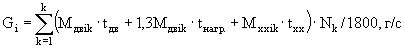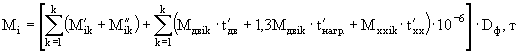 где Мдвik и Мххik - удельные выбросы загрязняющих веществ дорожными машинами, соответственно, при движении без нагрузки и при работе на холостом ходу (табл.2.3 и 2.4 в [35]); 1,3Мдвik - удельный выброс загрязняющих веществ при движении под нагрузкой, рассчитанный исходя из того, что при увеличении нагрузки увеличивается расход топлива; Nk - наибольшее количество дорожных машин каждого k-того вида, работающих одновременно в течение 30-ти минут; k - количество учитываемых видов дорожно-строительных машин. Валовой выброс рассчитывается для каждого периода года по каждому виду ДМ по формуле: