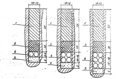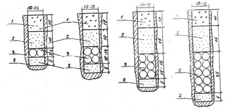 Рис. 2. Схема заполнения борозд при защите кабеля питания мастикой РБВ: I - мастика РБВ; 2 - мелкозернистый песок; 3 – промасленный жгут; 4 - кабель Примечание. Диаметр кабеля СЕ-4 - 5мм, кабеля КР3 - 6 мм.