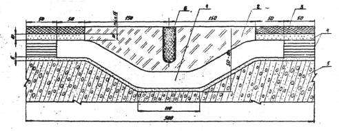 Рис. 3. Схема укладки проводов в местах пересечения борозд температурным швом: 1 - перхлорвиниловая трубка Ø 25 или 32 мм в зависимости от количества проводов; 2 - мастика РБВ; 3 - заливочная мастика; 4 - песок; 5 - бетон армированный; 6 - температурный шов 4. КОНТРОЛЬ КАЧЕСТВА ПРИготовления герметизирующих материалов и заполнения борозд4.1. В процессе приготовления мастики необходимо контролировать: весовую дозировку составляющих компаунда; равномерность перемешивания по всей массе мастики; температуру разогрева мастик РБВ и БМТВ. 4.2. Термостойкость мастики проверяется после завершения ее формирования проходом тепловой машины в режиме ее эксплуатации в зимний период. Не допускается расплавление и выдувание мастики в борозде. 4.3. Для обеспечения надежной герметизации и предохранения проводов от повреждений необходимо осуществлять систематический контроль за состоянием мастики в борозде. На участках, где произошло отслоение мастики или ее выкрашивание, следует произвести очистку разрушенного участка с последующим заполнением мастикой. 5. ТРАНСПОРТИРОВАНИЕ И ХРАНЕНИЕ МАТЕРИАЛОВ КОМПАУНДА УП-5-122АТ5.1. Компоненты компаунда хранятся в герметически закрытой таре в обычном складском помещении при температуре не выше +30°С в условиях, обеспечивающих сохранность продукта и тары. 5.2. Компаунд готовится непосредственно перед применением из исходных компонентов. Свежеприготовленные компаунды хранению не подлежат. 5.3. Гарантийный срок хранения отдельных компонентов обусловлен действующей нормативно-технической документацией и составляет: для эпоксидной модифицированной смолы - 6 месяцев; отвердителя полиэтиленполиамина - 6 месяцев; ускорителя марки УП-606/2 - 6 месяцев; тиокола - 3 года. 5.4. РБВ выпускается заводом-изготовителем, транспортируется и хранится в виде кусков весом по 10-15 кг или в бумажных мешках весом до 35 кг. 5.5. При хранении и транспортировке герметик должен быть защищен от воздействия солнечных лучей и увлажнения. 6. ТРЕБОВАНИЯ ТЕХНИКИ БЕЗОПАСНОСТИ6.1. Неотвержденный компаунд УП-5-122АТ и составляющие его компоненты при непосредственном контакте оказывают раздражающее действие на кожу человека, проявляющееся в виде экзем и дерматитов. Поэтому все работники, занимающиеся приготовлением и применением мастик, должны быть обеспечены защитной спецодеждой. 6.2. Все операции по приготовлению компаунда УП-5-122АТ должны производиться на открытом воздухе. 6.3. Брызги смолы, отвердителя или пластификатора должны быть немедленно удалены сухим тампоном с последующей обработкой кожи спиртом и промывкой теплой водой. 6.4. Компоненты эпоксидных компаундов (смола, тиокол, отвердитель) горят при внесении в источник огня. Средствами пожаротушения являются вода, пар и углекислотные огнетушители. На месте производства работ по разогреву мастик нужно иметь противопожарные средства тушения (огнетушитель, ящик с песком). 6.5. Для приготовления, транспортировки и применения мастик РБВ разрешается пользоваться только исправными механизмами и приспособлениями. 6.6. При разогреве герметизирующего материала необходимо следить за работой топливных форсунок. 6.7. Следует своевременно очищать котлы и топки от нагара. 6.8. Необходимо соблюдать осторожность при переливе горячей мастики из котла в агрегаты для заливки швов. 6.9. При разогреве герметизирующего ма