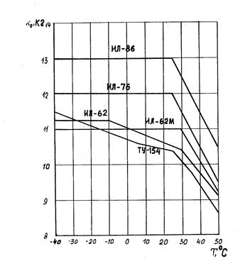 где Т - расчетная температура воздуха (определяется согласно Моc НГЭА СССР-80); Р - расчетное атмосферное давление, кПа (определяетcя согласно Мос НГЭА СССР-80); GВЗЛ - расчетная взлетная масса самолета, кг; GПОС - расчетная посадочная масса самолета, кг; K - количество двигателей расчетного самолета, шт.; Ro - тяга двигателя самолета на взлетном режиме, кг; Су - коэффициент подъемной силы крыла расчетного самолета; SКР - площадь крыла расчетного самолета, м2. Тяга двигателя самолета на взлетном режиме Rо определяется по графику рис. I. Коэффициент подъемной силы СУ и площадь крыла расчетного самолета SКР принимается по таблице.