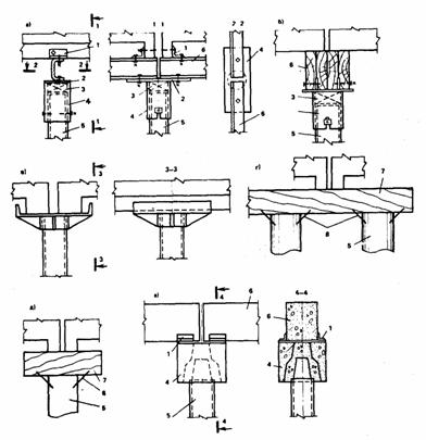 Рис. 10. Опорный узел каркасного здания 1.12. Проектирование фундаментов рекомендуется выполнять, как правило, в следующем порядке: оцениваются мерзлотно-грунтовые и климатические условия площадки (пп. 2.1-2.4) и проверяется соблюдение требований по защите площадки, указанных в пп. 3.5-3.7; вычисляются расчетные глубины сезонного протаивания (или промерзания) грунтов на площадке (п. 5.6, СНиП II-18-76) и многолетнего протаивания под зданием (пп 7.1-7.4); устанавливается принцип использования вечномерзлых грунтов в качестве основания (п. 3.1) в условиях природного их сложения, а так же при регулировании их температурного режима в случае необходимости путем применения подсыпки или теплоизоляции; выявляются возможные варианты фундаментов, производится их сопоставление и выбор проектного решения (пп. 1.6 - 1.8); выполняется детальное проектирование оснований и фундаментов выбранного типа по рекомендациям разд. 9-12.