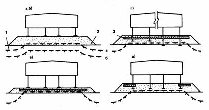 ограниченной зоне протаивания Плиты пенополистирола укладываются с перевязкой швов, заполняемых гидроизоляцией, и закрепляются деревянными штырями. Для обеспечения стока поверхностных вод плиты укладываются с уклоном, повторяющим уклон поверхности подсыпки. 8.9. При применении теплоизоляции для регулирования температурного режима основания рекомендуется принимать во внимание следующее: сохранение вечномерзлого состояния грунтов под зданиями без подполий за счет увеличения термического сопротивления пола может быть достигнуто только при небольшом сроке их службы на одной площадке в районах с низкими среднегодовыми температурами воздуха; утепление отмосток для уменьшения глубины сезонного промерзания у здания без подполья увеличивает глубину многолетнего протаивания грунтов под его серединой, что может вызвать необходимость дополнительного заглубления фундаментов; в этих случаях для исключения нормальных сил пучения под подошвами малозаглубленных фундаментов может оказаться более целесообразной сдвижка их внутрь здания (рис. 26); аналогичную сдвижку фундаментов в плане целесообразно производить и под зданиями с вентилируемыми подпольями, проектируя утепленные отмостки лишь там, где эта сдвижка не может быть произведена по конструктивным условиям. 8.10. Возможные схемы применения подсыпок показаны на рис. 27: схема I - теплозащитная подсыпка, устраиваемая для сохранения природного положения ВГВМ с целью предупреждения сезонного протаивания грунтов с повышенной льдистостью (ii > 0,1), либо конструктивная подсыпка, устраиваемая для уменьшения влияния нормальных сил пучения на незаглубленные и малозаглубленные фундаменты; схема II - конструктивная подсыпка, устраиваемая для опирания на нее фундаментов и обеспечения необходимой несущей способности природных грунтов, что достигается понижением их максимальной температуры на уровне природной поверхности до требуемой; схема III - то же, но с применением слоя эффективной теплоизоляции для уменьшения толщины подсыпки; схема IV - частный случай схемы III, соответствующий минимальной толщине подcыпки. Рис. 27. Схемы теплоизоляционных подсыпок (I-IV)