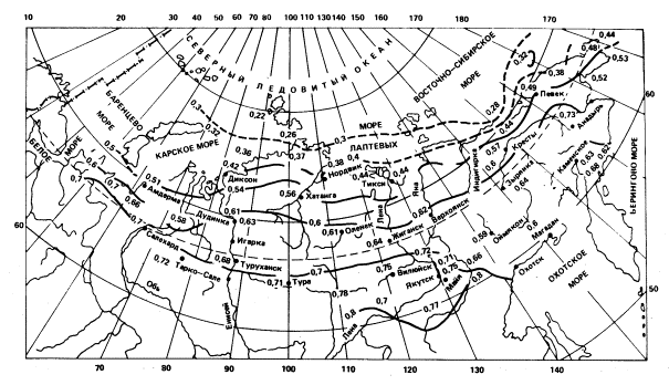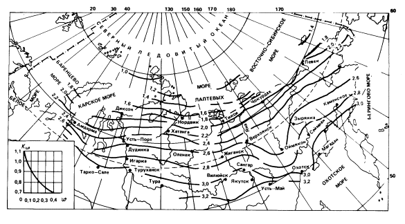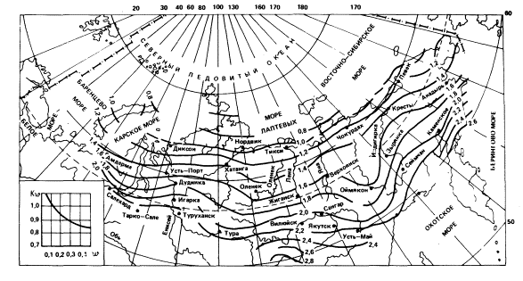 Примечание. Знаком «*» обозначена вода, в порах грунта незамёрзшая. Рис. 23. Карта значений Т1 Рис. 24. Карта значений t1 (ч) 5.6. Расчетная глубина сезонного протаивания грунтов dth определяется через нормативную dth,n по формуле где kh’ - коэффициент теплового влияния, принимаемый равным у наружных стел под отмостками с асфальтовым и другим черным покрытием - 1;2; то же, без таких покрытий - 0,9; у внутренних опор - 0,8. 6. РАСЧЕТНЫЕ ТЕМПЕРАТУРЫ ГРУНТОВ6.1. При использовании вечномерзлых грунтов по принципу I применяются следующие их расчетные температуры: при расчете столбчатых фундаментов Тm - максимальная на глубине z от ВГВМ; при расчете свай - Тe - эквивалентная в пределах глубины z; Tz -расчетная на глубине z. 6.2. Расчетные температуры Т для зданий с холодным подпольем, когда не производится предпостроечное охлаждение основания или не предусматривается повышение природных температур вечномерзлых грунтов, вычисляются по формуле (12) ; в остальных случаях - по указаниям СНиП II-18-76. где T0