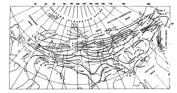 Рис. 19. Изолинии глубин сезонного протаивания глинистых грунтов