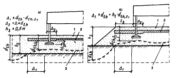 Рис. 29. Схемы укладки теплоизоляции у края здания Дня расчета толщины теплоизоляции вне здания формула (28) применима, если IB/hS ≥3. 8.16. Для исключения теплового влияния участков с различными условиями на поверхности вылет теплоизоляции, укладываемой вне здания, за наружную грань крайних фундаментов Δ1, и за край здания Δ2 (рис. 29) определяется из условий: для случая