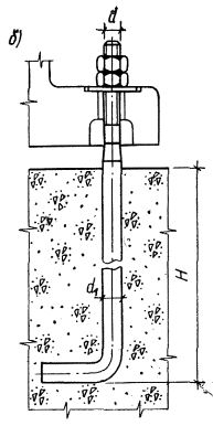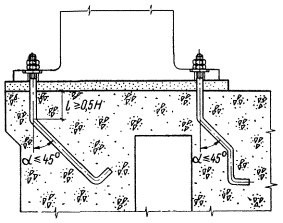 Рис. 17. Виды гнутых болтов и установка их в фундаментах 4.20 (4.18). Диаметры конструктивных болтов должны быть указаны в задании на проектирование фундаментов. При отсутствии указаний диаметры конструктивных болтов назначаются в соответствии с диаметром отверстий в опорных частях оборудования. 4.21. Примеры расчета фундаментных болтов приведены в прил. 3 настоящего Руководства. 5. ОСНОВНЫЕ ТРЕБОВАНИЯ К УСТАНОВКЕ БОЛТОВ5.1 (5.2). Глухие болты с отгибами и анкерными плитами (типы болтов 1-5), а также анкерная арматура съемных болтов (типы болтов 6-8) должны устанавливаться в фундамент до бетонирования на специальных кондукторах, строго фиксирующих и обеспечивающих проектное положение болтов и анкерной арматуры при бетонировании фундамента. В этих случаях рекомендуется применять съемные кондукторы и объединять болты в блоки, а также использовать плазово-блочные методы монтажа и другие мероприятия, направленные на снижение расхода металла и повышение точности установки. 5.2 (5.3). При расположении глухих болтов с отгибами у края фундамента отогнутый конец болта необходимо ориентировать в сторону массива, а при расположении в углах - по их биссектрисе. Нижние концы болтов, расположенные в местах пустот фундаментов (проемов, тоннелей и др.), допускается выполнять изогнутыми (рис. 17), при этом угол изгиба болтов к вертикали должен составлять не более 45°, а длина прямого участка у начала заделки l принимается не менее 0,5Н. 5.3 (5.4). Верхние концы глухих болтов (типы болтов 1 и 3) допускается изгибать, для чего вокруг верхней части болтов должны быть заранее устроены круглые или квадратные шанцы, размеры которых назначаются по табл. 8. Глубина H заделки болтов в бетон в этом случае назначается (при соблюдении требований, приведенных в п. 4.6 настоящего Руководства) от низа шанцев не менее 25d - для болтов с отгибами (тип болта 1) и не менее 12d - для болтов с анкерными плитами (тип болта 3). Максимальная величина смещения верхнего конца болтов при изгибе не должна превышать 2d. 5.4 (5.5). Болты на эпоксидном клею, конические с цементной зачеканкой, распорными цангами и втулками, а также с распорным конусом устанавливаются в скважины, просверленные в бетоне или железобетоне специальным механизированным инструментом. Таблица 8(7)