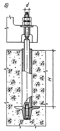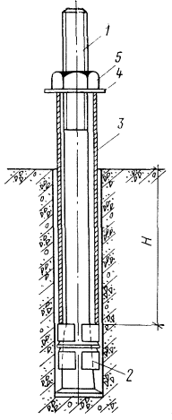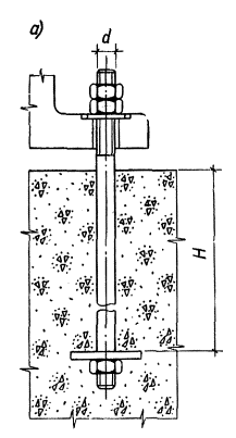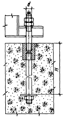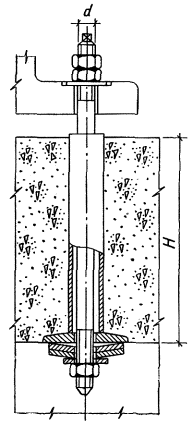 плитами Рис. 3. Фундаментный болт составной с анкерной плитой с резьбой диаметром от М24 до М64 (тип 5) 2.3 (2.3). Болты глухие, устанавливаемые непосредственно в массив фундамента, могут выполняться: - с отгибами (рис. 1); - с анкерными плитами (рис. 2); - составными с анкерными плитами (рис. 3). Болты с отгибами, как наиболее простые в изготовлении, должны применяться в случаях, когда высота фундаментов не зависит от глубины заделки болтов в бетон. Болты с анкерными плитами, имеющие меньшую глубину заделки в бетон по сравнению с болтами с отгибами, должны применяться в случаях, когда высота фундамента определяется глубиной заделки болтов в бетон. Болты составные с анкерными плитами применяются в случаях установки оборудования методом поворота или надвижки (например, при монтаже вертикальных цилиндрических аппаратов химической промышленности). В этих случаях муфта и нижняя шпилька с анкерной плитой устанавливается в массив фундамента во время бетонирования, а верхняя шпилька ввертывается в муфту на всю длину резьбы после установки оборудования через отверстия в опорных частях. 2.4 (2.4). Болты съемные, устанавливаемые в массив фундамента с изолирующей трубой, могут выполняться: - без амортизирующих элементов (рис. 4); - с амортизирующими элементами (тарельчатыми пружинами) (рис. 5). Болты без амортизирующих элементов состоят из шпильки и анкерной арматуры (трубы и плиты). Анкерная арматура закладывается в фундамент во время бетонирования фундамента, а шпилька устанавливается свободно в трубе после устройства фундамента.