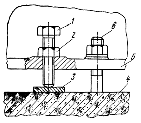 Выверка оборудования на установочных гайках с помощью тарельчатых шайб 3.43. Выверку оборудования на установочных гайках без упругих элементов следует производить регулированием положения гаек на болтах по высоте. По окончании выверки установочные гайки выгораживают опалубкой, которую удаляют после схватывания бетонной смеси (через 2-3 сут. после подливки). Перед окончательной затяжкой болтов установочные гайки опускают на 3-4 мм. Оставшиеся ниши заполняют составом, используемым для подливки. Этот способ выверки применим, если диаметр фундаментных болтов не превышает 36 мм. 3.44. При выверке на установочных гайках с использованием конических болтов с распорными цангами (тип болта 11) или с распорной втулкой (тип болта 12) для их фиксации в фундаменте необходимо устанавливать дополнительно гайки с шайбами (рис. 14,б). ВЫВЕРКА ОБОРУДОВАНИЯ НА ПАКЕТАХ МЕТАЛЛИЧЕСКИХ ПОДКЛАДОК3.45. Пакеты металлических подкладок применяют в качестве как постоянных (несущих), так и в качестве временных (выверочных) опорных элементов. 3.46. Пакеты набирают из стальных или чугунных подкладок толщиной 5 мм и более. Достижение проектного уровня установки оборудования осуществляют в процессе его предварительного закрепления с помощью регулировочных подкладок толщиной 0,5- 5 мм. 3.47. Подкладни в пакетах, используемых в качестве постоянных опорных элементов, должны быть плоскими, без заусенцев, выпуклостей и впадин. В состав пакета кроме плоских могут входить клиновые и другие, регулируемые по высоте подкладки. Количество подкладок в пакете должно быть минимальным и не превышать 5 шт., включая и тонколистовые. Поверхность бетона фундамента под пакетами подкладок должна быть тщательно выверена. После окончательной затяжки болтов подкладки прихватывают между собой электросваркой. 3.48. Рекомендуемые размеры подкладок (в зависимости от массы машин) приведены в табл. 2. Количество несущих пакетов подкладок определяется из условия п. 3.4, а временных, используемых для выверки оборудования - по п. 3.14. Подливка оборудования3.49. Подливка оборудования должна осуществляться бетонной смесью, цементно-песчаными или специальными растворами после предварительной (для конструкций стыков вида 2) или после окончательной (для конструкций стыков вида 1) затяжки гаек болтов. Рис. 15 Схема