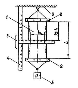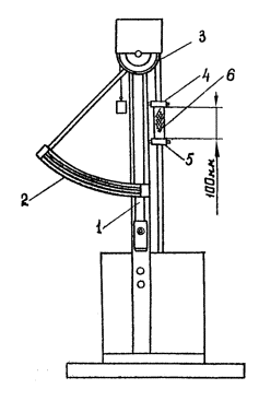 силоизмерителя, 3.4.Оценка результатов: За результат испытаний принимают среднее арифметическое из трех испытанных образцов, соответственно вырезанных вдоль и поперек холста. Значение разрывной прочности выражают в ньютонах с точностью до первого десятичного знака. ЗФМ считается выдержавший испытания и может быть применен для всех способов обертывания дренажных труб если разрывная прочность (в том числе во влажном состоянии) ≥ 50 Н/см, а относителъное удлинение при разрывной нагрузке ≥ 10%. Если относительное удлинение <<10%, то ЗФМ рекомендуется применять для обертывания дренажных труб непосредственно на дреноукладчике. Результаты испытаний вносят в графы 4 и 5 таблицы (см. приложение). 4. МЕТОДИКА определения относительной поперечной усадки ЗФМ4.1.Отбор образцов Образцы материала отбирают по нормативно-технической документации, утвержденной в установленном порядке по ГОСТ 13587-77, Из каждого отобранного образца материала вырезают три продольные полоски длиной 300 мм и шириной 50 мм. Пробные полосы не должны иметь перекоса и смятых мест. 4.2. Аппаратура Для проведения испытаний применяется приспособление (рис. 4.1.), состоящее из следующих основных частей: зажимов 2, груза 3, линейки 4, рейсшины 5, опорного блока 6. Линейка по ГОСТ 427-75, Рейсшина по ТУ 569/205-1-5-73. 4.3. Проведение испытания Пробная полоска материала 1 закрепляется в зажимах 2 (расстояние L = 200 мм) и подвешивается груз 3, который совместно c нижним зажимом составляет 40 Н. После выдерживания в течение 60 с под нагрузкой измеряют ширину средней части образца ЗФМ. 4.4. Оценка результатов Относительная поперечная усадка ЗФМ при растяжении в процентах вычисляется по формуле: