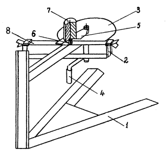 3 - груз; ЗФМ считается выдержавшим испытания, еоли ни на одном из трех образцов относительная поперечная усадка не была больше 10%. Среднеарифметический результат вносят в графу 6 таблицы (см. приложение). 5. МЕТОДИКА определения раЗрЫвной прочности при контактной нагрузке5.1. Отбор образцов Образцы материала отбирают по нормативно-технической документации, утвержденной в установленном порядке по ГОСТ 13587-77. Из отобранного образца материала вырезают три продольные полоски длиной 250 мм и шириной 50 мм. Пробные полоски из мест сгиба не вырезают, расстояние от кромки материала должно быть не менее 5 см. Пробные полоски не должны иметь перекоса и смятых мест. 5.2. Аппаратура Для проведения испытаний применяется устройство (рис. 5.1.), состоящее из следующих основных частей: основание 1, зажимное устройство 2, контактная поверхность в виде диска 3 с приводом 4, подставка с коническим упором 5 опорная пята 6 (пл. 1 см2) и груз 7. 5.3. Проведение испытания Образец ЗФМ 8 устанавливают в зажимное устройство 2, при этом средняя часть образца укладывается на подвижный металлический диск 3 (контактную поверхность). На ось диска 3 устанавливают подставку с коническим упором 5. На образец ЗФМ 8 под коническим упором 5 устанавливают опорную пяту 6. На подставку соосно с осью конического упора 5 устанавливают груз 7. С помощью привода (ручки) 4 вращают диск 3 с окружной скоростью 8-10 см/с (20 об/мин диска). При этом опорная пята 6 движется (скользит) по испытываемому образу 8 синхронно с перемещением контактной поверхности 3. Рис. 5.1. Схема устройства для испытания рулонных ЗФМ на разрывную прочность при контактной нагрузке: 1 - основание, 2 - зажимное устройство, 3 -контактная поверхность, 4 - привод , 5 - подставка с коническим упором, 6 - опорная пята, 7 - груз, 8 - образец ЗФМ Если при контактном давлении 0,8 МПа (нагрузка) при однократном проходе опорной пяты (длина хода 60-80 мм) по поверхности ЗФМ протиров или разрывов на образце не наблюдается, то обрааец считается выдержавшим испытания. Если под действием контактной нагрузки в 0,8 МПа происходит разрыв образца, то для выявления его прочности нагрузку на опорную пяту уменьшают (с заменой образца) до тех пор, пока при однократном проходе опорной пяты по поверхности ЗФМ не происходит его повреждение. По величине контактной нагрузки, под действием которой при однократном проходе опорной пяты образец начинает повреждаться, определяют разрывную прочность ЗФМ. 5.4. Оценка результатов ЗФМ считается выдержавшим испытания, если ни на одной иа трех (не менее) испытанных образцов при однократном проходе опорной пяты по поверхности ЗФМ под контактной нагрузкой 0,8 МПа не зафиксировано протира или разрыва. Результаты испытания вносят в графу 7 таблицы (см. приложение). 6. МЕТОДИКА определения разрывной прочности при изгибе с кручением6.1. Отбор образцов Образцы материала отбирают по нормативно-технической документации, утвержденной в установленном порядке по ГОСТ 13587-77 Из отобранного образца материала вырезают три продольные полоски длиной 800 мм и шириной 50 мм. Из мест сгиба пробные полоски не вырезают, расстояние от кромки материала должно быть не менее 5 см. Пробные полооки не должны иметь перекоса и смятых мест. 6.2. Аппаратура Для проведения испытания применяется устройство (рис 6.1. и 6.2.), состоящее из следующих основных частей: основания 1; рамки 