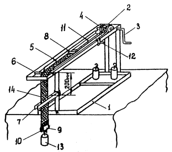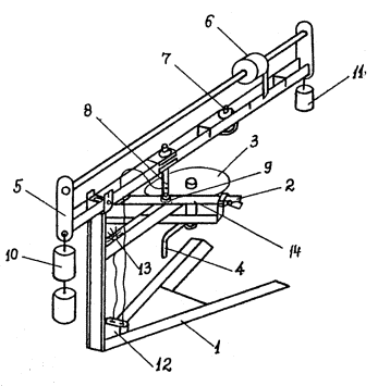 J - коэффициент износоустойчивости; δ - толщина ЗФМ, см; Lδ - длина пути ЗФМ по контактной поверхности до протирания ЗФМ, см; R - расстояние от центра диска (контактной поверхности) до центра приложения нагрузки к ЗФМ, см; n - число оборотов диска. Рис. 7.1. Схема устройства для определения износоустойчивости рулонных ЗФМ: I - основание, 2 - зажимное устройство, 3 -контактная поверхность, 4 - привод, 5 – двуплечий рычаг, 6 - гиря с указателем, 7 – противовесов, 8 - упор, 9 - опорная пята, 10 - гири, 11 - гиря, 12 - батарейка, 13 - сигнальная лампочка, 14 - образец ЗФМ. Для данного