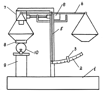 ЗФМ считается выдержавшим испытания, если все испытанные образцы (не менее трех) имеют значение J ≤ 2·10-4, За результат испытания принимается среднее арифметическое значение коэффициента износоустойчивости всех испытанных образцов. Результат испытания вносят в графу 9 таблицы (см. приложение). 8. МЕТОДИКА определения жесткости зфм (метод кольца)Жесткость - нагрузка, необходимая для прогиба согнутого в кольцо образца на 1/3 диаметра. 8.1. Отбор образцов Образцы материала отбирают по нормативно-технической документации, утвержденной в установленном порядке по ГОСТ 13587-77. Из отобранного образца вырезают три поперечные полосы длиной 160 мм и шириной 20 мм. Пробные полосы не должны иметь перекоса, разрывов, трещин и смятых мест. 8.2. Аппаратура . Для проведения испытаний применяют прибор типа ПЖУ 12М (ГОСТ 8977-74). Упрощенная схема прибора дана на рис.8.1. Прибор состоит из следующих основных частей: корпуса 1, шкалы 2, ограничителя 3, технических весов 4, стрелки 5, электродвигателя 6, бункера для шариков 7, нажимной площадки 8, столика со съемной площадкой 9.