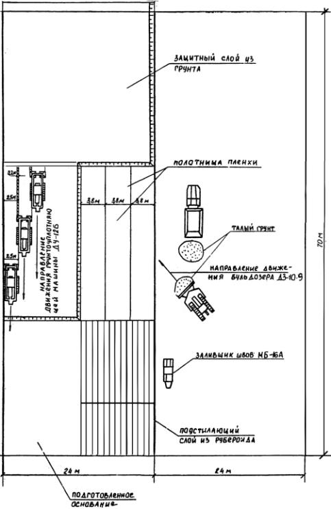 МИНИСТЕРСТВО МЕЛИОРАЦИИ И ВОДНОГО ХОЗЯЙСТВА СССР ВСЕСОЮЗНЫЙ ГОЛОВНОЙ ПРОЕКТНО-ТЕХНЛОГИЧЕСКИЙ ИНСТИТУТ "СОЮЗОРГТЕХВОДСТРОЙ" ЮЖНЫЙ НАУЧНО-ИССЛЕДОВАТЕЛЬСКИЙ ИНСТИТУТ ГИДРОТЕХНИКИ И МЕЛИОРАЦИИ ТЕХНОЛОГИЧЕСКИЕ СХЕМЫУСТРОЙСТВА ПРОТИВОФИЛЬТРАЦИОННЫХПЛЕНОЧНЫХ ЭКРАНОВ НА КАНАЛАХ И ВОДОЕМАХПРИ ОТРИЦАТЕЛЬНЫХ ТЕМПЕРАТУРАХМОСКВА 1988 Технологические схемы устройства противофильтрационных пленочных экранов на каналах и водоемах при отрицательных температурах разработаны отделом технологии водохозяйственного строительства ВГПТИ "Союзоргтехводстрой" (Перевезенцев Л.Н., Кузнецов А.И., Маркина Г.Г., Бухалова Н.Г.) совместно с ЮжНИИГиМом (Галицкий P.P., Пушкарный В.Н.). В работе принимали участие НИМИ (Косиченко Ю.М.), СибНИИГиМ (Родионов B.C.). Схемы рассмотрены и утверждены научно-техническим советом ВГПТИ ''Союзоргтехводстрой" (протокол № 8 от 30 ноября 1987 г.). ОглавлениеОБЛАСТЬ ПРИМЕНЕНИЯТехнологические схемы устройства противофильтрационных пленочных экранов предназначены для применения при проектировании производства работ и организации строительства каналов и водоемов при отрицательных температурах с использованием для склеивания пленочных полотнищ битумно-полимерной мастики, разработанной СибНИИГиМом. Работа содержит технологические схемы на: - устройство грунтопленочного экрана водоема; - устройство канала с облицовкой сборными железобетонными плитами по пленочному экрану; - предохранение грунта от промерзания. Приведены таблицы объемов работ, технико-экономических показателей, основных строительных материалов, дающие возможность определить потребное количество ресурсов. ТЕХНИЧЕСКИЕ ТРЕБОВАНИЯ И ОСНОВНЫЕ ПОЛОЖЕНИЯ ТЕХНОЛОГИИ ПРОИЗВОДСТВА РАБОТДля разработки схем принят равнинный рельеф местности, грунты Ш группы, непро-садочные, имеющие нормальную влажность. Глубина промерзания 1м. При разработке схем производства работ учтены требования, предусмотренные следующими нормативными документами: СНиП 2.06.03-85 "Мелиоративные системы и сооружения"; СНиП 3.07.03-85 "Мелиоративные системы и сооружения"; СНиП III-8-76 "Земляные сооружения"; СН 551-82 "Инструкция по проектированию и строительству противофильтрационных устройств из полиэтиленовой пленки для искусственных водоемов"; ОСТ 33-2.2.05-86 "Каналы оросительных систем трапецеидальные на расходы по 10 м3/с. Поперечные сечения". УСТРОЙСТВО ГРУНТОПЛЕНОЧНОГО ЭКРАНА НА ВОДОЕМЕ ПРИ ОТРИЦАТЕЛЬНЫХ ТЕМПЕРАТУРАХТехнологическая схема разработана на устройство грунтопленочного экрана на водоеме в период отрицательных температур. Размеры водоема приняты условно: ширина по дну 90 м, длина - 140 м, глубина - 10 м, заложение откосов 1:7. План водоема представлен на рис.1. На рис.2 приведена схема устройства грунтопленочного экрана на дне водоема, на рис.3 - на откосах водоема. До начала работ по устройству грунтопленочного экрана выполняется разбивка поверхности откосов и дна водоема на участки, площадь которых назначается кз условия выполнения всего технологического процесса от расчистки снега до уплотнения защитного слоя в течение двух смен. Ориентировочная площадь участков 1680 м2 (140×12 или 70×24 м) Очистка участков от снега и их планировка выполняется автогрейдером ДЗ-9 8 за три прохода по одному следу. Для защиты пленочного экрана от повреждений устраивается подстилающий слой из рубероида (ГОСТ 10923