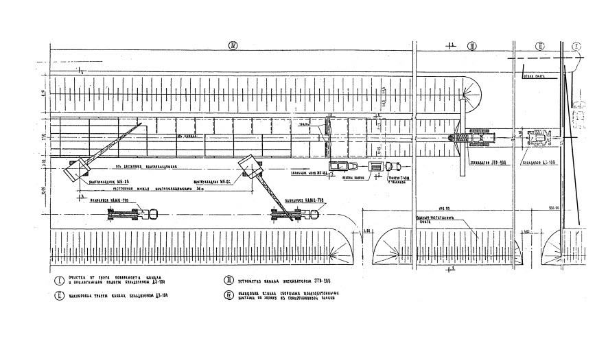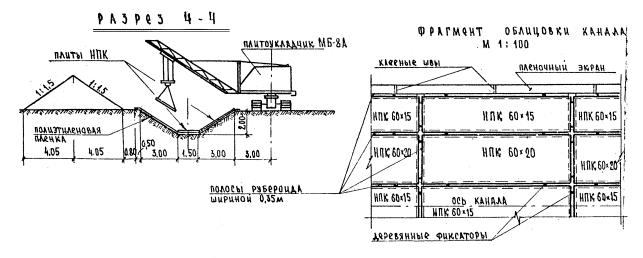УСТРОЙСТВО КАНАЛА С ОБЛИЦОВКОЙ СБОРНЫМИ ЖЕЛЕЗОБЕТОННЫМИ ПЛИТАМИ ПО ПЛЕНОЧНОМУ ЭКРАНУТехнологическая схема разработана на устройство канала сечением 9,0 м (ширина по дну - 1,5 м, глубина - 2,0 м, заложение откосов 1:1,5) в период отрицательных температур с облицовкой сборными железобетонными плитами по пленочному экрану (рис.4, 5). Разработка канала выполняется в грунтах, предохраненных от промерзания в период отрицательных температур. До начала работ полосу шириной 34 м очищают от снега бульдозером ДЗ-109. Снег складируют в отвал. Для расчета трудозатрат толщина снежного покрова принята 0,3 м. Для обеспечения заданного уклона поверхность трассы канала планируют бульдозером ДЗ-109 за три прохода по одному следу. Разработку канала производят шнекороторным экскаватором ЭТР-208. Выгрузка грунта предусмотрена в отвал на одну сторону. Дно и откосы канала рабочий орган экскаватора выполняет ровными, дополнительной зачистки и планировки эти поверхности не требуют. Незначительные каверны, которые могут образовываться в зоне промерзания верхнего разрыхленного грунта, засыпают перед укладкой пленки сухим песком или другими сыпучими материалами. Противофильтрационный экран выполняют из полиэтиленовой пленки, предназначенной для мелиоративного строительства. Ширина полотнищ принята 4,0 м, толщина -0,4 мм. К месту производства работ пленку доставляют на тракторной тележке, снабженной разматывающим устройством. Пленку укладывают по периметру канала с откоса на откос. Длина одного полотнища составляет 10,7 м с учетом 10% на свободное натяжение. Края пленки на берме канала пригружаются подручными средствами (обрезки досок, горбыля). Следующее полотнище пленки укладывают с нахлестом 10 см на ранее уложенное. Склеивание пленки выполняют битумно-полимерной мастикой, разработанной СибНИИГиМом для отрицательных температур. Состав мастики приведен в табл.1. Мастика доставляется к месту производства работ заливщиком швов МБ-16А, с помощью которого выполняется и склеивание полотнищ пленки. Монтаж плит ведется "с колес" плитоукладчиками МБ-8А. С целью предохранения пленки от повреждения гранями плит перед монтажом под стыки укладывают полосы рубероида. Для обеспечения необходимого зазора между плитами устанавливают деревянные фиксаторы. Выступающий край пленочного экрана на берме канала после монтажа плит подворачивают, прикрывают полосами рубероида и прижимают подручными средствами. Устройство канала в период отрицательных температур выполняют по участкам, площадь которых назначается из условия выполнения всего технологического процесса от расчистки снега до монтажа плит в течение рабочего дня. С этой целью и для работы основного оборудования без простоев предусмотрена разработка канала одним экскаватором ЭТР-208, а устройство пленочного экрана и облицовка канала плитами - двумя бригадами общей численностью восемь человек, которым приданы два плитоукладчика МБ-8А и один заливщик швов МБ-16А. Ориентировочная длина участка канала, выполняемая за одну смену, составляет 140 м. Устройство заплечиков из монолитного бетона и заделка стыков между плитами выполняются в период положительных температур ив технологической схеме не рассмотрены. Объемы работ на 1000 м канала сечением 9 м приведены в табл.5. УСТРОЙСТВО КАНАЛА С ОБЛИЦОВКОЙ СБОРНЫМИ ЖЕЛЕЗОБЕТО