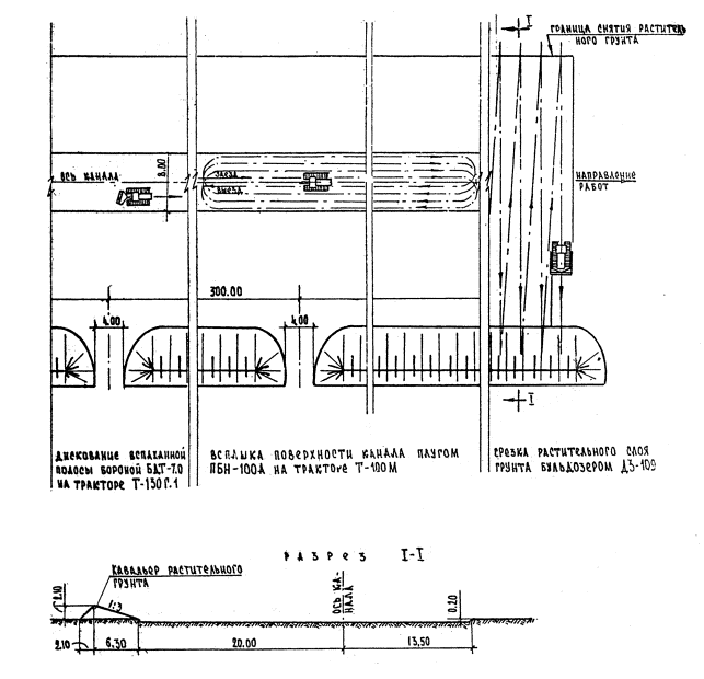ПРЕДОХРАНЕНИЕ ГРУНТА ОТ ПРОМЕРЗАНИЯ ДЛЯ СТРОИТЕЛЬСТВА КАНАЛА В ПЕРИОД ОТРИЦАТЕЛЬНЫХ ТЕМПЕРАТУРТехнологическая схема предусматривает мероприятия по предохранению грунта от промерзания (вспахивание, боронование), которые производят до наступления отрицательных температур (рис.6). До начала вспахивания грунта с трассы канала, основания кавальеров и полосы движения механизмов срезают слой растительного грунта толщиной 0,2 м. Срезка растительного грунта производится поперечными проходами бульдозера ДЗ-109ХЛ с перемещением во временный кавальер, расположенный с одной стороны очищаемого участка. Для проезда транспорта и механизмов в кавальере оставляют разрывы шириной 4,0 м через каждые 300 м. Вспахивание грунта осуществляют на глубину 0,35 м плугом ПБН-100А по загонной схеме движения тракторного агрегата параллельными ходами вдоль оси канала и холостыми заездами на концах загона. После вспахивания производят дискование поверхности грунта на глубину 0,15 м дисковой бороной БДТ-7,0 на тракторе Т-130.1.Г-1 в два следа с перекрытием на 0,3-0,5 м. Объемы работ на 1000 м канала приведены в табл.8. Таблица 8