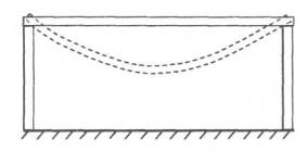 Рис. 4.1. Деформация стальной балки перекрытия Однако не все так просто, и наибольшая деформация происходит не всегда там, где имела место наибольшая температура, наиболее интенсивный и продолжительный нагрев. Она может быть и там, где конструктивный элемент несет более высокую нагрузку или на него действует наибольший изгибающий момент. Если, например, стальная балка перекрытия имеет наибольшую деформацию посередине пролета (рис. 4.1), то это абсолютно не значит, что именно в данной точке был наиболее интенсивный нагрев - просто именно здесь на балку действует наибольший изгибающий момент. И картина деформации, показанная на рис. 4.1, типична для большинства помещений, вне зависимости от расположения в них очага. Тем не менее, для рассредоточенных по зоне горения однотипных и относительно одинаково нагруженных конструкций оценить величину деформации в сравнении друг с другом очень полезно. Если, например, стальные балки перекрытия имеют распределение величин деформации такое, как показано на рис. 4.2, то это (при относительно равномерной пожарной нагрузке в помещении) можно рассматривать как явный признак направленности распространения горения.