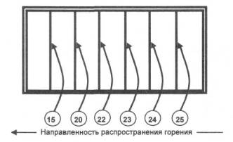 Рис. 4.6. Последовательно затухающие (нарастающие) термические поражения: а - периодически повторяющиеся; 6 - сплошные Деформации также происходят в сторону наиболее интенсивного теплового воздействия (т.е. в идеальном случае - в сторону очага). Все указанное выше относится к признакам направленности горения, формирующимся при развитии горения по горизонтали. Развитие горения по вертикали Основным механизмом, определяющим развитие горения по вертикали, является конвекция, уносящая тепло вверх и способствующая таким образом развитию горения в этом направлении. Учитывая это обстоятельство, в случае распространения горения по вертикали, очаг пожара в первую очередь следует предполагать в самой нижней зоне со следами горения. Как из любого правила, из него бывают исключения. Горящие предметы могут падать сверху вниз, создавая, таким образом, вторичные очаги горения. Но общее правило тем не менее остается в силе - в поисках очага следует двигаться по следам термических поражений вниз. К сожалению, на пожаре могут возникнуть следующие ситуации, усложняющие поиски очага по указанным выше признакам. Очаговые признаки не сформировались Такое может быть при быстром развитии горения, обусловленном хорошими условиями воздухообмена, мощным источником зажигания или применением инициатора горения, архитектурными особенностями здания (наличием пустот и др. факторами); пожароопасными свойствами отделки помещений, способствующими быстрому развитию горения. Нивелирование и исчезновение очаговых признаков в ходе развития горения Нивелирование (сглаживание) визуально наблюдаемых очаговых признаков, вплоть до их полного исчезновения происходит на пожаре достаточно часто. В случае такого рода пожаров остается единственное - применять инструментальные методы выявления скрытых очаговых признаков пожара (см. гл. 12) Вторичные очаги (очаги горения) Необходимо иметь в виду, что очаг пожара далеко не всегда совпадает с местом наибольших термических поражений конструкций и предметов. Помимо очагов пожара существуют так называемые очаги горения (ОГ). Местные ОГ образуются внутри основной площади горения и представляют собой зоны, где экстремально высокие термические поражения обусловлены сосредоточением пожарной нагрузки, либо более благоприятными условиями горения (притоком воздуха прежде всего), либо более поздней ликвидацией горения. Изолированные ОГ - это очаги, непосредственно не связанные с основной зоной горения. Образуются они за счет передачи теплоты на смежные постройки, сооружения, части здания радиацией, конвекцией, теплопроводностью, при попадании горящих углей, искр на горючие материалы вне зоны горения. Установление истинного очага пожара невозможно без дифференциации ОП и ОГ. Для этого необходимо тщательное изучение конструктивных особенностей здания (помещения), распределения пожарной нагрузки в нем. Рекомендации по данному вопросу приведены в разд. 5.6, 5.7. При решении вопроса о месте нахождения очага пожара учитываются также показания свидетелей, косвенные признаки очага и другие данные. Подробно методика установления очага пожара изложена в [17-20].