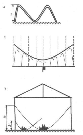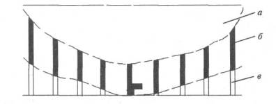 Рис. 4.2. Величины деформации однотипных стальных балок перекрытия, см Чтобы количественно оценить степень деформации, рассчитывают так называемую величину относительной деформации. Это отношение величины прогиба к величине участка конструкции, на которой этот прогиб наблюдается (b/l) (см. гл. 5). Взаимное расположение деформированных (обрушившихся) конструкцийПри осмотре места пожара нужно обращать внимание на взаимное расположение в пространстве деформированных (обрушившихся) конструкций. Иногда это дает полезную для установления очага пожара информацию. В частности, если одна металлоконструкция придавлена сверху другой, это необходимо отметить в протоколе осмотра как факт, позволяющий оценить последовательность обрушения или деформации отдельных конструктивных элементов здания. "Высота излома " вертикальных несущих конструкцийПри осмотре ряда однотипных вертикальных несущих металлоконструкций необходимо сравнивать минимальную высоту, на которой начинается существенная деформация каждой из конструкций. Замечено, что при нагреве в ходе пожара вертикальные несущие металлоконструкции (например, ангаров и других подобных сооружений) как бы "подламываются" на определенной высоте, в результате чего стальная арка, в частности, приобретает вид, показанный на рис. 4.3, а. Причем высота излома h тем меньше, чем ближе конструкция к очагу пожара (рис. 4.3, б). Данное явление вполне объяснимо - чем ближе очаг пожара к конструкции, тем на меньшей высоте она прогревается до критической температуры восходящими конвективными потоками (рис. 4.3, в). Таким образом, фиксация высоты излома вертикальных конструкций дает возможность проявить своеобразный "макроконус" - признак направленности распространения горения от очага к периферии. Значительные по величине локальные деформацииЗначительные по величине и четко выраженные локальные деформации металлоконструкций, особенно балок перекрытия и тому подобных элементов - важный очаговый признак, на который обязательно следует обращать внимание и фиксировать в протоколе осмотра (включая фото - и видеосъемку). Они обычно образуются на начальной стадии пожара под воздействием локального нагрева конвективным потоком и тепловым излучением от очага. Должно быть зафиксировано точное место расположения таких деформаций, их величина и направленность. Рис. 4.3. Деформации вертикальных элементов металлоконструкций на пожаре: h1 и h2 - высота зоны достижения критической температуры при различном удалении очага пожара от металлоконструкции