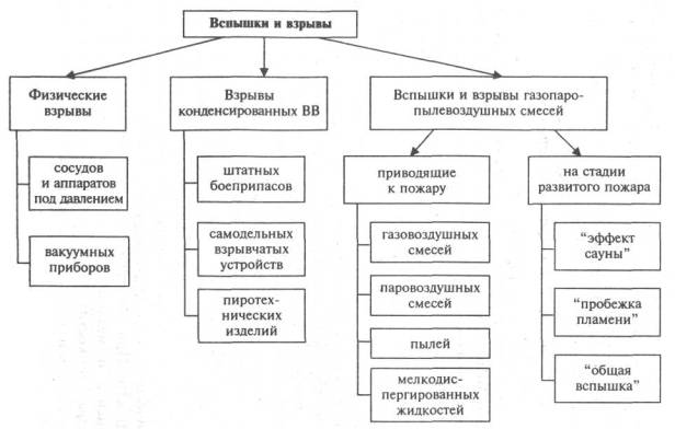 Рис. 4.4. Вспышки и взрывы, возможные на пожаре Горение конденсированных ВВ происходит в режиме взрыва и детонации, горение пылепарогазовоздушных смесей возможно в режиме как дефлаграции (вспышки), так и взрыва. По свидетельским показаниям дифференцировать эти явления невозможно (неподготовленный свидетель любой хлопок воспринимает как взрыв), поэтому установить природу произошедшего можно только по следам (последствиям) данных явлений. Дефлаграционное горение (вспышка) распространяется по пыле-, газо- или паро-воздушной смеси со сравнительно низкой скоростью (несколько метров в секунду). Повышение давления в замкнутом объеме носит пространственно равномерный характер и в основном является следствием роста среднеобъемной температуры. Для углеводородно-воздушных смесей среднее давление повышается на 0,6-0,8 МПа, что может вызвать разрушение ограждающих конструкций здания (сооружения). Дефлаграция способна распространяться симметрично во все стороны от источника зажигания. Кроме медленных дефлаграционных волн горения, в ППГВС могут возникать взрывные и детонационные волны. Первые распространяются по невозмущенной горючей смеси со скоростью менее 300 м/с, вторые - со скоростью более 300 м/с. При взрыве, в отличие от вспышки, фронт давления и температуры быстро расширяется от места загорания, при этом формируется ударная волна. Общее (фугасное) действие взрыва заключается в разрушениях под воздействием ударной волны. Наибольшее воздействие оказывает фронт давления при его прямом ударе в препятствие. Характер разрушений в зависимости от величины избыточного давления ударной волны давления приведен в табл. 4.5. Таблица 4.5Зависимость повреждений при взрыве от избыточного давления ударной волны [26]