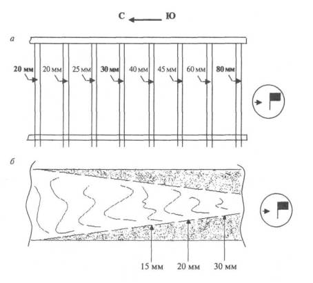 Термические поражения на одинаковых, повторяющихся в конструкции здания элементах - балках, лагах, стропилах, стойках - есть периодически повторяющиеся поражения (рис. 4.6, а.) Последовательно уменьшающаяся глубина обугливания бревна, деревянной стенки по их длине - это сплошные затухающие поражения (рис. 4.6, б). Произвольно расположенные признаки направленности распространения горения Формируются и на отдельных конструктивных элементах зданий и сооружений. Выражаются в одностороннем или преимущественном разрушении, выгорании конструкций и предметов со стороны, направленной к очагу пожара. Конвективные потоки и лучистые тепловые потоки больше прогревают участки конструкций, обращенных в сторону очага, и с этой стороны конструкции разрушаются больше, чем с обратной.