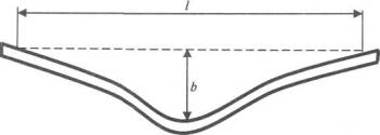 Измеренные на месте пожара величины Н можно и нужно использовать как критерий степени термического поражения древесины в различных зонах пожара. В отличие от древесины в древесностружечных плитах (ДСП) не наблюдается достаточно четко выраженного различия по плотности между углем и недест-руктированной частью, поэтому измерить глубину обугливания Н довольно сложно. Для ДСП измеряется убыль сечения плиты hn в точке отбора пробы. Убыль сечения плиты за счет выгорания происходит уже с первых минут и последовательно возрастает с увеличением температуры и длительности нагрева. Измерение так называемой величины относительной деформации металлоконструкций проводят в соответствии с рис. 5.2. Это отношение величины прогиба к величине участка конструкции, на которой этот прогиб наблюдается (b/l)