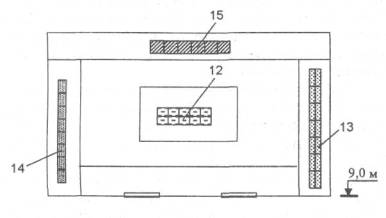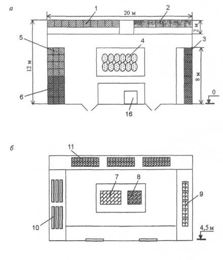 Рис. 5.4. Схема размещения пожарной нагрузки на многоярусном складе хозяйственных товаров: а - 1-й ярус; б - 2-й ярус; в - 3-й ярус; 1 - холодильники бытовые ("Норд", "Атлант", "Аристон") в картонных коробках - 10 шт.; 2 - то же, без упаковки - 8 шт.; 3 - картонные коробки размером 1x1 м (20 коробок) в два ряда по высоте со стеклянной посудой; 4 - мешки бумажные (50 кг) с цементом, гипсом, строительными смесями; 5 - картонные коробки (24 коробки, в каждой коробке пластмассовых деталей около 3-4 кг в два ряда по высоте) со светильниками (стекло, металл); 6 - картонные коробки (24 коробки, в каждой коробке пластмассовых деталей около 3-4 кг в два ряда по высоте) со светильниками (пластмасса, металл); 7 - твердая ДВП (оргалит) штабелем 2×1×2 м; 8 - картон упаковочный штабелем 2×1×2 м; 9 - картонные коробки (штабель высотой 1 м) с керамической плиткой; 10 - полиэтиленовая пленка в рулонах (6 рулонов по 3 м, масса рулона 100 кг); 11 - обои в рулонах (1000 шт., 1 рулон - 1,2 кг); 12 - растворители для лаков и красок (ацетон, уайт-спирит, № 646) (стеклянные бутылки 0,5л, 10ящиков по 12 бутылок); 13 - картонные коробки с гвоздями, шурупами (расфасовка в полиэтиленовые пакеты по 100г) (1×0,5×0,5м), в два ряда по 14 коробок; 14-8 деревянных ящиков с металлическими сантехническими изделиями - 0,5×1 м; 15 - сантехнические детали пластмассовые, 6 картонных ящиков по 15-20 кг; 16 - автокар