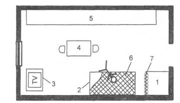 стенка; 6 - зона выгорания мебели (дивана); 7 - поверхностное обгорание