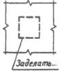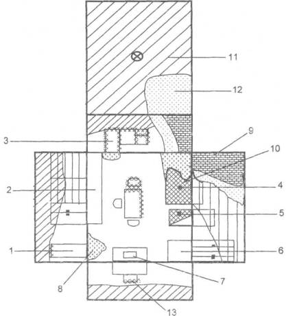Рис. 5.5, б. Развернутый план места пожара: 1 - дверь входная; 2 - мебельная стенка; 3 - балконная дверь и окно;4 - кровать; 5 - кресло; 6 - шкаф трехстворчатый; 7 - тумба с телевизором; 8 - обугливание линолеума; 9 - отслоение штукатурки; 10 - обугливание (выгорание) мебели; И - закопчение; 12 - выгорание копоти; 13 - поверхностное обугливание И на том, и на другом должны быть отражены термические поражения конструкций и предметов. Очень хорошо, если план нарисован с указанием основных геометрических размеров и в масштабе. Рекомендуемые обозначения термических поражений на планах приведены в приложении 3. Условным обозначением на плане показывается место нахождения и поза трупа, если таковой обнаружен на месте пожара. Наименования обозначенных на плане предметов расшифровываются в пояснительной надписи под планом. Чтобы план был понятен понятым, следователям, судьям и не было недоразумений в дальнейшем, дополнительно расшифровываются в пояснительных записях и условные обозначения термических поражений.