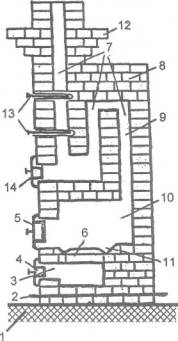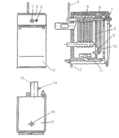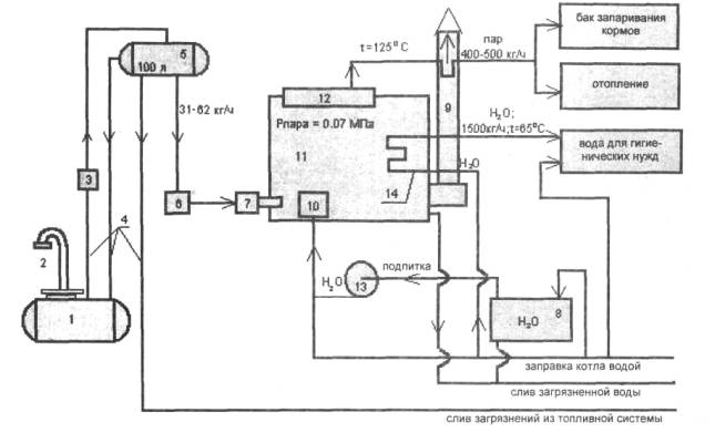 Рис.6.2. Технологическая схема парогенератора 1 - топливная емкость; 2 - дыхательный клапан; 3 - топливонасос; 4 - топливопроводы; 5 - расходный топливный бак; 6 - отстойник; 7 - горелочное устройство; 8 - питательный бак для воды; 9 - дымовая труба; 10 - противонакипное магнитное устройство; 11 - котел; 12 - сухопарник; 13 - электронасос; 14 - теплообменник Система водоподачи работает по следующей схеме. Вода из питательного бака 8 подается электронасосом 13 через противонакипное магнитное устройство 10 в барабан котла 11. Продукты сгорания, проходя через системы дымовых каналов, передают тепловую энергию испарительным поверхностям нагрева котла и далее через трубу 9 выбрасываются в окружающую среду. Образовавшийся пар направляется вверх в сухопарник 12, где происходит его очистка от водяных частиц и нагрев до температуры 125°С. Тепло дымовых газов также передается внутреннему теплообменнику с водой 14, которая нагревается до температуры 65 °С и подается потребителю. В технологическом процессе производства воздушного теплоносителя различают лишь две стадии - горение топлива и теплопередачу от дымовых газов к воздуху. Нагрев воздуха происходит в теплогенерирующих установках. Между продуктами сгорания и подогревом рабочего тела непосредственного контакта нет. Основными агрегатами и узлами тепло производящей установки (рис. 6.3) являются: топливная емкость 1, трубопроводы 4, расходный бак 5, отстойник 6, горелочное устройство 7, осевой главный вентилятор 9 и корпус генератора 10. Подача топлива к горелочному устройству и его сжигание происходит аналогично предыдущей схеме, факельным способом в топочном устройстве, тепло передается теплообменнику, а затем нагнетаемый вентилятором холодный воздух нагревается в кольцевом пространстве между камерой сгорания и теплообменником до 35-70°С и поступает к потребителю. Температура отходящих газов на выходе составляет около 360°С.