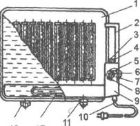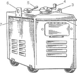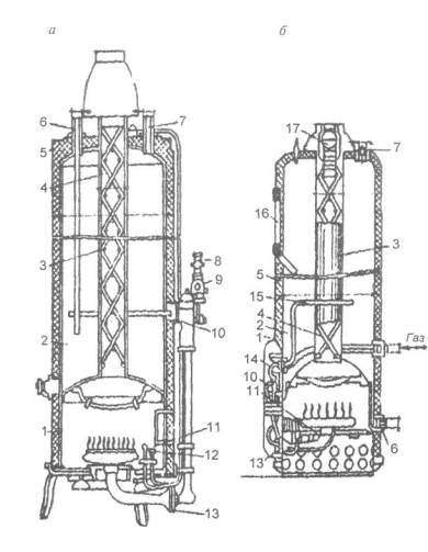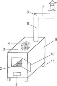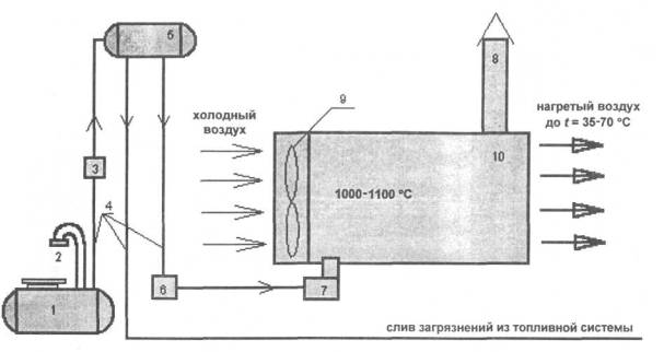 Рис. 6.3. Технологическая схема тепло генератора: 1 - топливная емкость; 2 - дыхательный клапан; 3 - топливо насос; 4 - топливопроводы; 5 - расходный топливный бак; 6 - отстойник; 7 - горелочное устройство; 8 - дымовая труба; 9 - осевой главный вентилятор; 10 - корпус теплогенератора 6.11.2. Возможные причины загораний ТГУПричины пожаров, связанных с работой теплогенерирующего оборудования, весьма разнообразны. Наиболее распространенные случаи обусловлены: - нарушением правил монтажа ТГУ; - нарушением правил технической эксплуатации, правил пожарной безопасности и техники безопасности; - пожароопасными особенностями технологического процесса и нарушениями этого технологического процесса. К первой группе могут быть отнесены случаи возникновения пожаров в связи с отсутствием или неисправностью регулирующих и защитных устройств, недостаточностью теплоизоляции, возможностью перегрева деталей и узлов генератора или из-за некачественных строительно-монтажных и пусконаладочных работ. Примером второй группы причин пожаров может быть выброс пламени из топки при нарушении правил розжига, при неисправности камеры сгорания дымовых каналов. К этой группе также следует отнести возникновение горения от электрической дуги и искр, возникающих при аварийном режиме работы электросети, а также причины, связанные с проведением различных ремонтных работ. 6.11.3. Осмотр установок после пожараПри осмотре места пожара, допросе свидетелей (опросе очевидцев, персонала, обслуживающего установку) необходимо устанавливать, в частности, следующие обстоятельства, косвенно указывающие на возможную причастность установки к возникновению пожара: - отсутствие признаков других причин возникновения пожара; - горение внутри помещения, где размещался генератор, или отапливаемого теплогенератором; - расположение агрегата в очаге пожара и факт его эксплуатации на момент пожара; - оставление работающего агрегата без обслуживающего персонала на длительное время; - аварийный режим работы электросети, водо - и пароподачи; - факты нахождения вблизи агрегата горючих материалов и емкостей с ЛВЖ или ГЖ; - пламя распространялось интенсивно с выделением густого черного дыма и специфического запаха топлива; - работа теплогенерирующей установки в режиме вибрации. Некоторые из этих признаков могут быть и не связаны с загоранием ТГУ, но более вероятной причиной возникновения при этом является все-таки аварийная работа теплогенерирующей установки. Всю работу по изучению установки после пожара целесообразно разбить на этапы. Первый этап включает установление назначения теплогенерирующей установки, факта ее эксплуатации на момент возникновения пожара, а также сложившейся обстановки до происшествия и во время его возникновения, развития и тушения пожара. Это можно установить при осмотре места происшествия, из показаний очевидцев, свидетелей, которые выявляются на стадиях дознания, предварительного следствия. На втором этапе путем исследования термических поражений окружающих конструкций и предметов, а также самой установки выясняется место возникновения (очаг) пожара, наличие горючих веществ и материалов, способных воспламениться от теплоагрегата, характер температурных повреждений отдельных узлов агрегата. Выясняется состояние конструкций здания в зоне прохождени