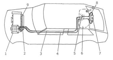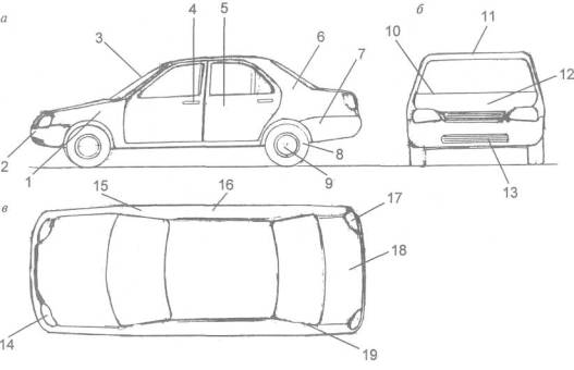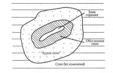 Рис. 6.4. Зоны, возникающие в сене при микробиологическом самовозгорании 6.16. АвтомобилиОсмотр места пожара при загорании автомобиля подразумевает осмотр не только самого сгоревшего автомобиля, но и места (территории), где он находился во время пожара. Проводится осмотр в определенной последовательности с фиксацией всех этапов осмотра на фото - или (желательно) видеокамеру (см. гл. 10). 1. Фиксация местонахождения транспортного средства на момент осмотра Практика исследования пожаров показывает, что после тушения автомобиль часто находится не в том месте, где произошел пожар. Это может быть по следующим причинам: - автомобиль убран с проезжей части, т. к. мешал движению; - сгоревший автомобиль перевезен с места пожара в гараж или другое место владельцем; - имела место неудачная попытка угона; - автомобиль перемещен при тушении пожарными; - произошло самопроизвольное движение автомобиля вследствие замыкания стартерного провода на основной в результате обгорания изоляции (как правило, это происходит у замка зажигания). Последняя ситуация возможна, если автомобиль во время стоянки находился с включенной передачей. Поэтому необходимо обращать внимание на положение рычага переключения передач автомобиля. 2. Осмотр окружающей территории Прилегающая территория осматривается в целях обнаружения следов преступника и средств поджога (факелов, спичек, зажигалок, емкостей из-под горючих жидкостей и т. п.), а также каких-либо искусственных препятствий быстрому тушению пожара. Если автомобиль загорелся при движении, должны быть зафиксированы следы торможения (или отсутствие таковых), их точное расположение, направление, размеры и характер. Отдельно осматривается место непосредственно под днищем автомобиля. При этом необходимо обращать внимание на характер повреждения от огня днища, наличие под ним посторонних предметов: битого стекла, оплавленных полиэтиленовых емкостей, оплавленных аэрозольных упаковок, остатков пиротехнических устройств, скопление (особенно у колес или под бензобаком) остатков сгораемого мусора и т. п. 3. Наружный осмотр корпуса автомобиля и описание его термических поражений При наружном осмотре описываются внешние механические и термические повреждения кузова, колес, дверей, капота, бензобака. Необходимо указать место, направление, размеры, характер повреждения. Указываются места расположения, размеры и форма сохранившихся участков красочного покрытия, протяженность зоны перехода от неповрежденного участка к поверхности, на которой полностью выгорело красочное покрытие (на этом участке поверхность металла имеет беловато-сероватый оттенок). Затем описываются следы отжига металла, появление на нем окалины, окопчения конструктивных элементов, деформация кузова. Термические повреждения дверей, крышек моторного и багажного отсеков и крыльев желательно сопоставить с термическими повреждениями этих деталей с внутренней стороны, совмещая нижние зоны выгорания красочного покрытия на них. Такой порядок осмотра дает возможность установить направленность распространения горения и, в первом приближении, место расположения очага (снаружи или внутри транспортного средства). Особое внимание обращается на характер разрушения остекления: место расположения осколков или оплавленных их частей (внутри салона или 