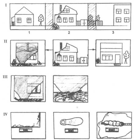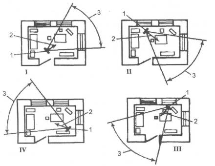I - ориентирующая съемка (круговая панорама); II - обзорная фотосъемка; III - узловая съемка; IV - детальная съемка (масштабная) Типы панорам в практике исследования пожаров могут быть следующие: - круговая панорама, охватывающая местность в пределах круга, т. е. 360°; - секторная панорама, охватывающая местность в пределах, меньших 360°; - линейная панорама, охватывающая пространство не в угловом, а в линейном измерении. Секторная панорама является наиболее распространенной. Наилучшие результаты при съемке этой панорамы получаются с применением штатива, когда фотоаппарат укреплен на специальной панорамной головке, которая представляет собой приспособление, поворачивающееся относительно вертикальной оси не менее чем на 360°. Способ круговой панорамы - применяется для съемки с большого расстояния. Объект фотографируют с одной точки по частям, поворачивая аппарат на штативной головке или (при отсутствии штатива) поворачиваясь с аппаратом в руках и оставаясь при этом на одном месте. Способ линейной панорамы - применяется для съемки ^близкого расстояния, когда размеры помещения не позволяют отойти на достаточное расстояние. Объект фотографируется по частям с нескольких точек, находящихся на одинаковом расстоянии от него. В каждый последующий кадр должна входить часть объекта с предыдущего кадра. Порядок обзорной съемки в помещении показан также на рис. 10.2, на котором цифрами обозначены последовательно выполняемые кадры фотосъемки; стрелками показаны угол захвата фотообъектива, направление и точки съемки.