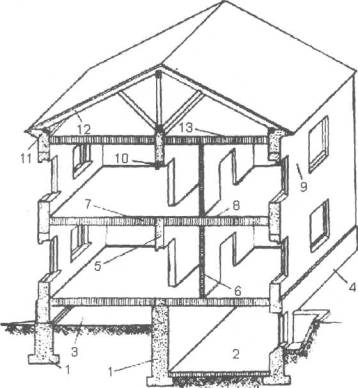 Рис. П. 1.1. Аксонометрический разрез здания с внутренней капитальной стеной: 1 - фундамент; 2 - подвал; 3 - подполье; 4 - цоколь; 5 - внутренняя капитальная стена; 6 - перегородка; 7 - междуэтажное перекрытие; 8 - пол; 9 - простенок; 10 - перемычка; 11 - карниз; 12 - стропила; 13 - чердачное перекрытие