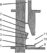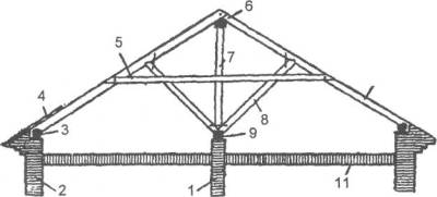 Рис. П. 1.3. Деревянная конструкция с наклонными стропилами: 1 - внутренняя стена; 2 - наружная стена;3 - мацерлат; 4 - кровля и основание под нее; 5 - ригель или схватка; 6 - коньковый прогон; 7 - стойка; 8 - подкос; 9 - лежень;10 - стропильная балка; 11 - чердачное перекрытие