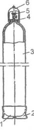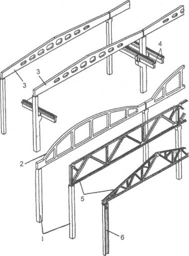 Рис. П. 1.4. Железобетонные и стальные конструкции промышленных зданий: 1 - железобетонные колонны; 2 - железобетонная безраскосная ферма;3 - железобетонные стропильные балки; 4 - железобетонные подкрановые балки; 5 - стальные стропильные фермы; 6 - стальная колонна