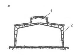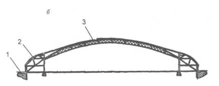 Рис. П. 1.5. Стальные несущие конструкции покрытий: а - рама:1 - фонарь; 2 - рама; б - арка из прокатных элементов:1 - железобетонный фундамент; 2 - стальной каркас; 3 - двухшарнирная арка