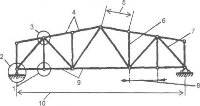 Рис. П. 1.6. Конструктивные элементы фермы: 1 - промежуточный узел нижнего пояса; 2 - опорный узел; 3 - промежуточный узел верхнего пояса; 4 - верхний пояс; 5 - панель верхнего пояса; 6 - стойка; 7 - раскос; 8 - панель нижнего пояса; 9 - нижний пояс; 10 - пролет фермы