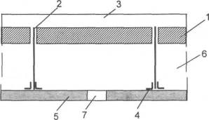 Рис. П. 1.8. Железобетонное перекрытие с подвесным потолком: 1 - плита перекрытия; 2 - металлическая стержневая подвеска; 3 - пол; 4 - металлический каркас подвесного потолка; 5 - плита подвесного потолка; 6 - пустотное пространство; 7 - встроенный светильник