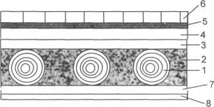 Рис. П. 1.9. Пустотное деревянное перекрытие: 1 - несущие балки (деревянные, стальные); 2 - засыпка (теплозвукоизоляция);3 - лага пола; 4 - черновой пол (доски, ДСП, ЦСП); 5 - пароизоляция; 6 - чистый пол (доски, паркет, линолеум, плитка); 7 - подшивка потолка; 8 - декоративное покрытие потолка
