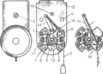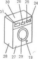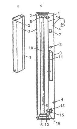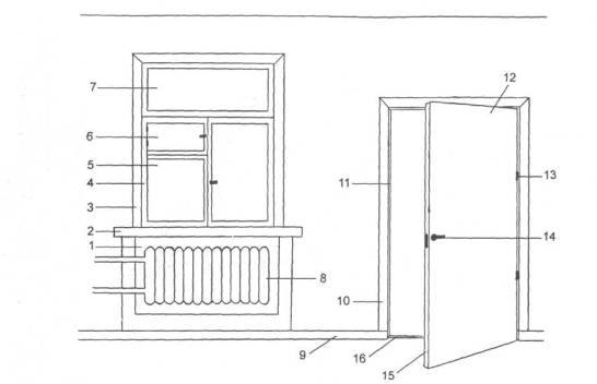 Рис. П. 1.13. Фрагмент стены помещения: 1 - ниша для радиатора; 2 - подоконная рама (подоконник); 3 - оконная коробка (закрыта наличником); 4 - створка оконной рамы; 5 - оконное остекление; 6 - форточка; 7 - глухая фрамуга; 8 - радиатор отопления; 9 - плинтус; 10 - наличник; 11 - дверная коробка (имеет верхний, нижний, боковые брусья); 12 - дверное полотно; 13 - дверная петля; 14 - дверная ручка; 15 - торец двери; 16 - порог 1.2. Мебель