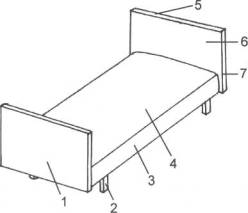 Рис. П. 1.14. Одинарная кровать: 1 - ножная спинка; 2 - ножка; 3 - обвязка (царга); 4 - обтяжка матраца;5 - верхняя кромка головной спинки; 6 - головная спинка; 7 - боковая кромка головной спинки