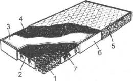 Рис. П. 1.15. Матрац, изготовленный на пружинном блоке и настилочном материале (поролон): 1 - пружинный блок; 2 - покровочный слой; 3 - настилочный слой поролона с малой объемной массой; 4 - настилочный слой (шерсть); 5 - облицовочная ткань; 6 - поролон для формирования бортов с большой объемной массой; 7 - поролон для бортов