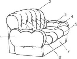 Рис. П. 1.16. Диван-кровать: 1 - внешняя поверхность боковины; 2 - спинка; 3 - внутренняя поверхность боковины; 4 - сиденье; 5 - торец сиденья; 6 - передняя часть боковины; 7 - передняя стенка основания дивана