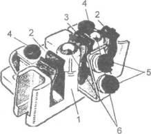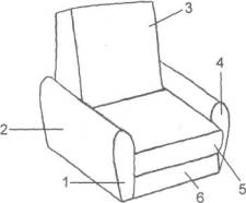 Рис. П. 1.17. Кресло для отдыха: 1 - боковина (подлокотник); 2 - борт спинки; 3 - спинка; 4 - передняя часть боковины; 5 - подушка сиденья; 6 - передняя стенка основания кресла