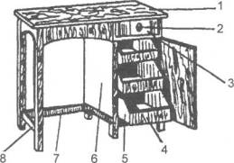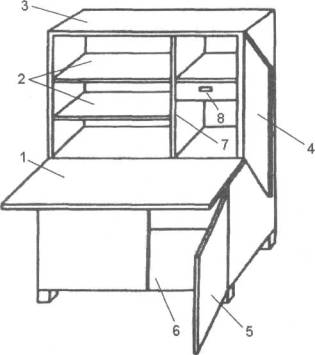 Рис. П. 1.25. Секретер: 1 - выдвижная (откидная) доска; 2 - внутренние полки для книг; 3 - верхняя доска; 4 - дверца (створка) шкафчика; 5 - нижняя правая дверца (створка); 6 - дно; 7 - перегородка; 8 - выдвижной ящик