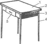 Рис. П. 1.19. Стол обеденный прямоугольный: 1 - крышка; 2 - кромка; 3 - обвязка (царга); 4 - ножка; 5 - передняя стенка ящика