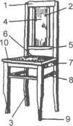 Рис. П. 1.20. Стул: 1 - спинка; 2 - вертикальный брусок спинки; 3 - задняя ножка; 4 - обивка спинки; 5 - поперечный брусок спинки; 6 - сиденье; 7 - боковой брусок обвязки (царга); 8 - проножка; 9 - передняя ножка; 10 - рамка сиденья